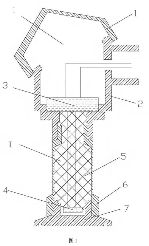 已不能及時(shí)將熱量傳導(dǎo)、吸收、擴(kuò)散,此時(shí)磁性器件的磁性將會(huì)消失,片式電容的絕緣材料失效,半導(dǎo)體燒毀,器件封裝損壞,電路引腳焊點(diǎn)脫焊,電路板3將發(fā)生***性損壞,導(dǎo)致變送器報(bào)廢,加大了生產(chǎn)成本,影響上述行業(yè)順利生產(chǎn)甚至引發(fā)事故,為避免上述現(xiàn)象發(fā)生,本發(fā)明采用散熱硅膠5填充第二空腔Ⅱ來(lái)解決,由于硅膠良好的散熱性,熱能大部分被隔離,所以傳遞到上部電路板3部分的熱量將大大減少,從而保護(hù)電路板3部分不受高溫影響,再者采用本發(fā)明,配合上部被增大的***房狀空腔Ⅰ的空腔體積以及與外界的接觸面積來(lái)進(jìn)一步助于電路板3空導(dǎo)散熱,雙管齊下,大大提高高溫密閉環(huán)境下的器件性能,安全可靠,具體制作時(shí),殼體2底部可選設(shè)計(jì)成外徑為50.5mm的平整面,平膜測(cè)量接頭7適配50.5的卡箍,實(shí)現(xiàn)測(cè)量部分無(wú)死角便于生產(chǎn)設(shè)備清洗和滅菌,也避免了螺紋連接時(shí)所測(cè)量的物料互相污染的情況;在平膜測(cè)量接頭7底部連接處制有凹槽,凹槽處加weisheng級(jí)硅膠密封圈,適配卡箍,使得被測(cè)物料無(wú)滲漏,確保密封性。